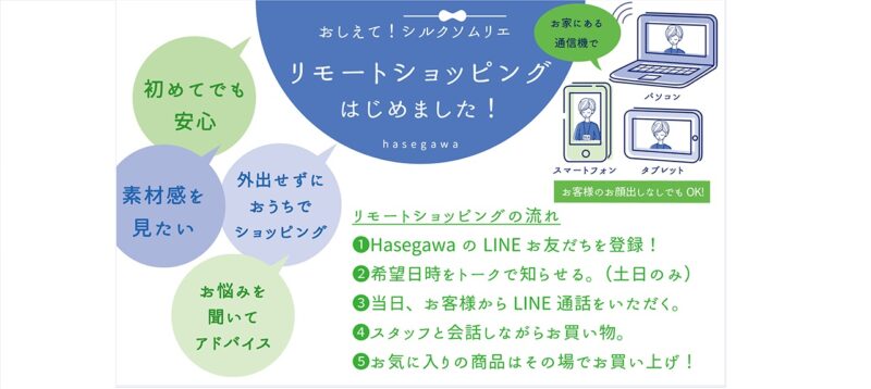 From April 9, 2022, we will start a new store-visiting service that introduces 1to1 products online and is close to customers, similar to “SHOP HASEGAWA”.