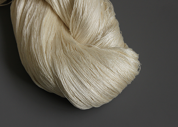 Short fibers generated by the spun silk manufacturing process (10 -30 mm) are re-spun on a special machine. The characteristic of this yarn is silk 100% but having a simple and plain handmade feel.