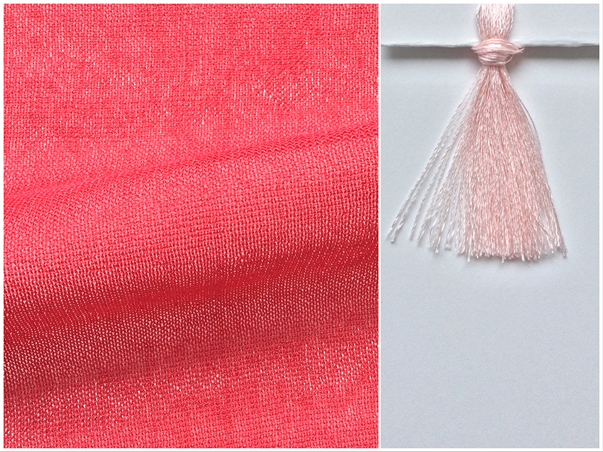 A twist of mercerized cotton yarn and Mulberry silk filament yarn. Special processing that exposes filament yarn. The touch is smooth and has little fluff, and the luster of silk is 100% expressed.