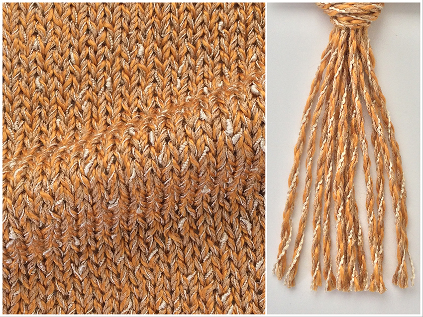 Dry-touch spun silk lily yarn and silk / wool blended yarn cords are twisted with filament knots. Knots insist in places in the dry yarn.